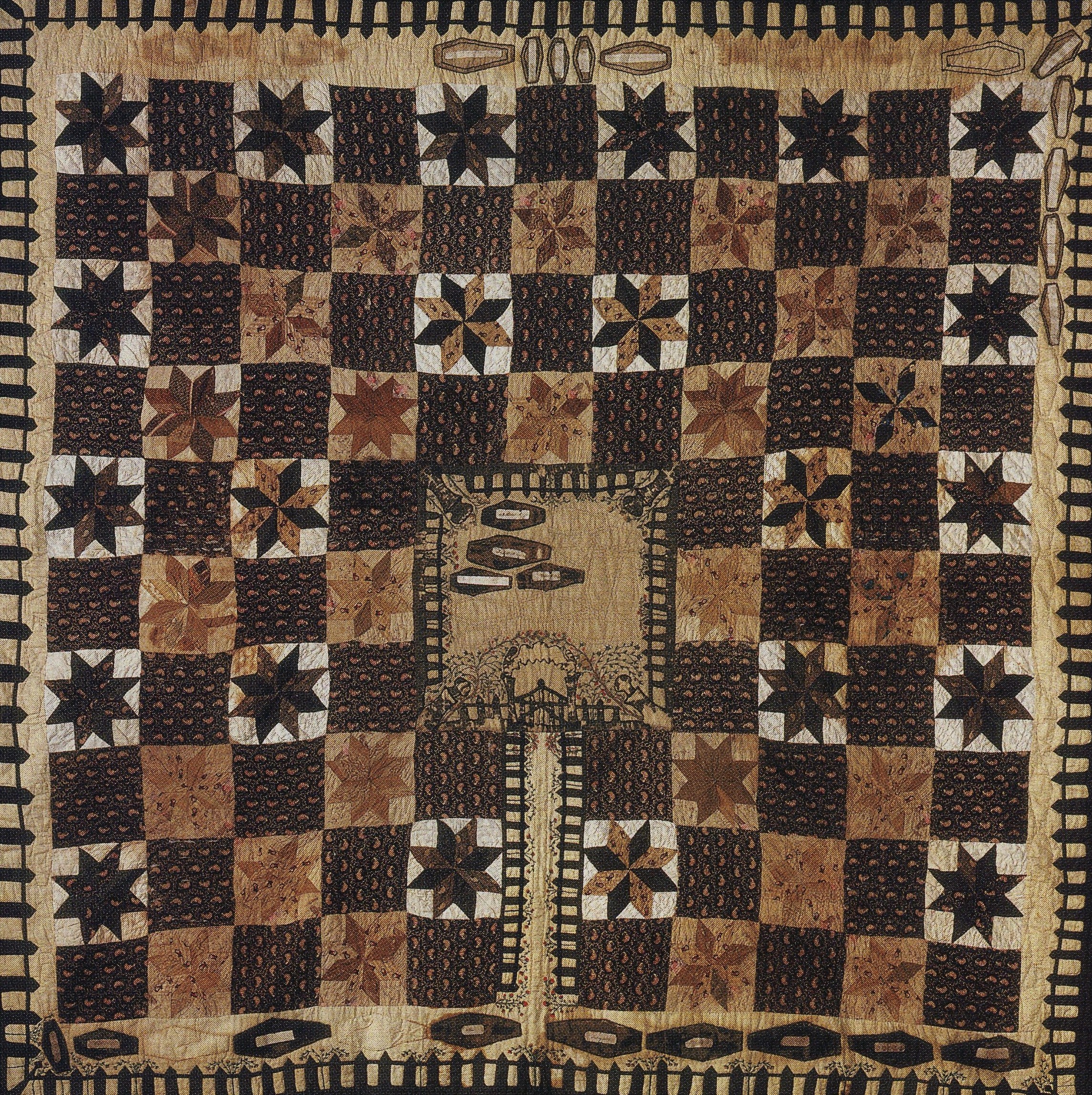 Apart from the artwork and design of quilts, there is often a family legacy in the finished project. For me, it is the visual I still get of my grandmother, her sisters, and my great-grandmother all sitting around together and sewing a quilt while their children play outdoors. I picture them laughing and talking about life and their families. It is MY connection to that moment in time and I feel even more a part of them. So, when I read about The Graveyard Quilt, although my initial reaction was the sadness involved by picturing this woman sitting down and adding cloth coffins, I also admire her passion to preserve the history of her family. Granted, the procedure she followed would have been too emotional and fatalistic for me. There is no way that when a child was born in my family, I would have felt right about making a cloth coffin for them to put on the family quilt. BUT, for Elizabeth Roseberry Mitchell, her initial process of mourning became a passionate desire to maintain family history and remembrance of all who passed on in her family…and it was done perhaps the only way she knew how — through quilting. The end result, family history was preserved.