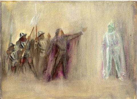 Costume Sketch for Hamlet Act I featuring father of Hamlet and Spirit Warriors  Numerous great works of classic literature feature ghosts or spectral apparitions including:  ‘A Christmas Carol’ by Charles Dickens (1843), ‘The Woman in White’ by Wilkie Collins (1859), ‘The Canterville Ghost’ by Oscar Wilde (1887), ‘The Turn of the Screw’ by Henry James (1898), ‘The Shining’ by Stephen King (1997), as well as ‘Macbeth’ (1606) and ‘Hamlet’ (1602) by William Shakespeare. [Pictured: Costume sketch for Hamlet, Act I, featuring the father of Hamlet and the spirit warriors. Public Domain]